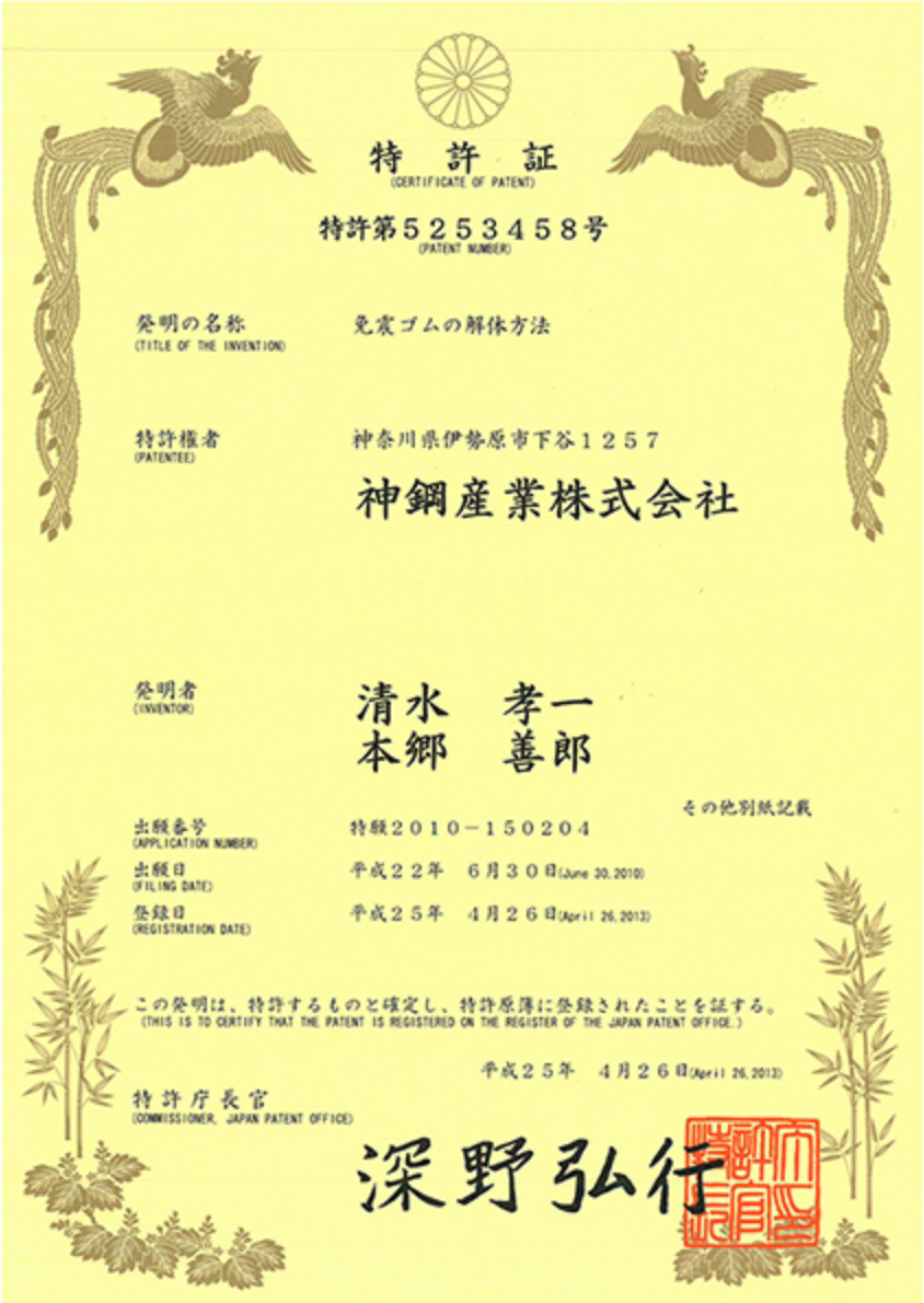 | 登録範囲 | ・タイヤ、ゴム加工品を含む、産業廃棄物及び一般廃棄物の収集運搬並びに中間処理 ・リサイクル製品の販売 |